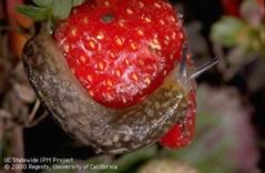 Snails and slugs are among the most bothersome pests in many garden and landscape situations. On plants they chew irregular holes with smooth edges in leaves and flowers and can clip succulent plant parts. They can also chew fruit and young plant bark. Because they prefer succulent foliage or flowers, they are primarily pests of seedlings and herbaceous plants, but they are also serious pests of ripening fruits, such as strawberries, artichokes, and tomatoes, that are close to the ground.