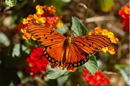 Each year the numbers and variety of nectar plants in your garden can be increased. Try adding a few caterpillar food plants (host plants) such as dill or wild fennel for the anise swallowtail, mustard or cabbage for the cabbage butterfly, and passion vine for the gulf fritillary. While most adult butterflies feed on nectar from a variety of flowers, caterpillars have different requirements. Some species of caterpillars will munch happily on leaves of several different plants, some will accept only one family of plants, and others will feed on only one genus or species. Native plants attract many species of butterflies. Click this link http://www.cnpssd.org to go to The California Native Plant Society for lists of natives that attract butterflies.